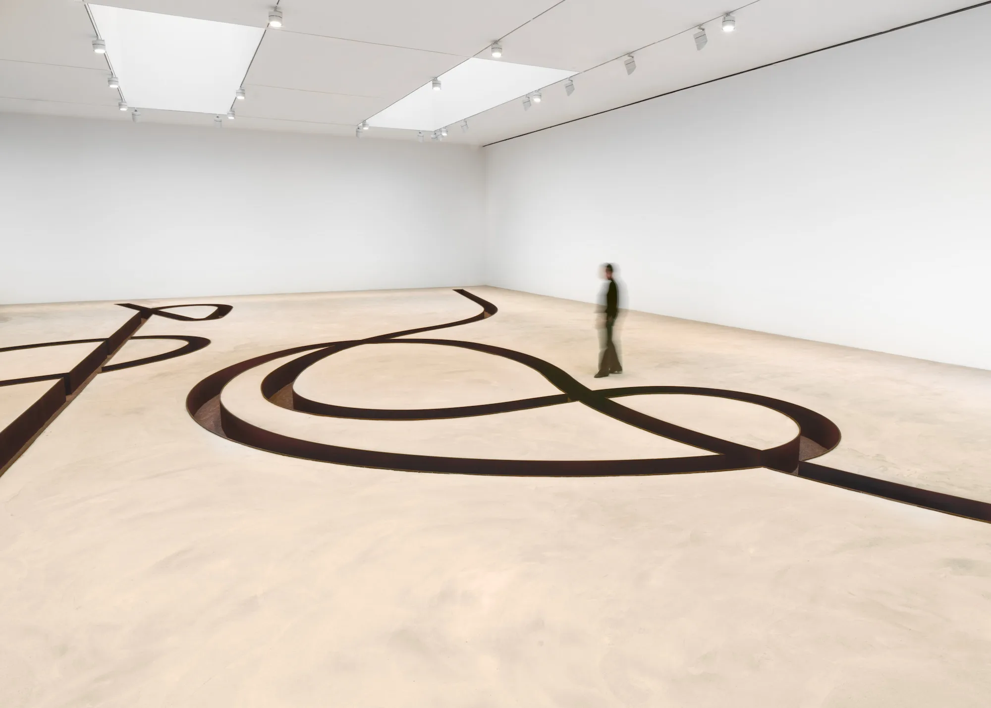 Esse pensamento aparece de forma concentrada em Convoluted Line A e Convoluted Line B (2024), desenvolvidas para o espaço da galeria em Nova York. As duas obras percorrem o piso de concreto como linhas contínuas, inseridas na superfície. À primeira vista, podem ser lidas como desenho. Ao se aproximar, revelam sua dimensão física e a escala do gesto.