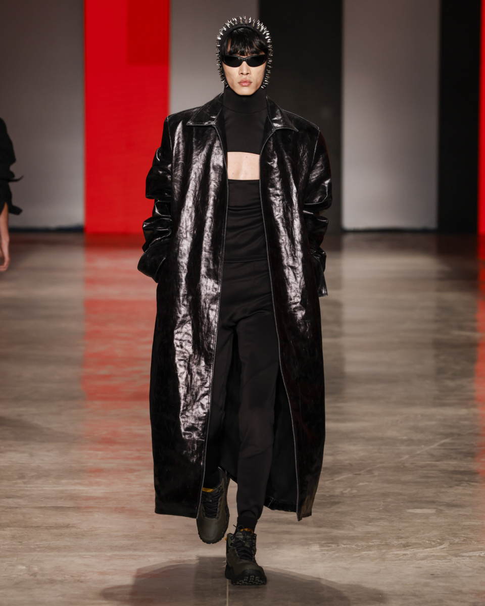 A coleção foi apresentada em três blocos bem definidos, cada um com uma identidade única. O primeiro trouxe uma paleta de preto fosco e resinado, explorando transparências que revelavam silhuetas com ousadia. Recortes estratégicos nas peças e detalhes metálicos, como tachas e ilhoses nas amarrações, reforçavam a atitude irreverente e o apelo visual marcante, em uma referência clara à moda alternativa.