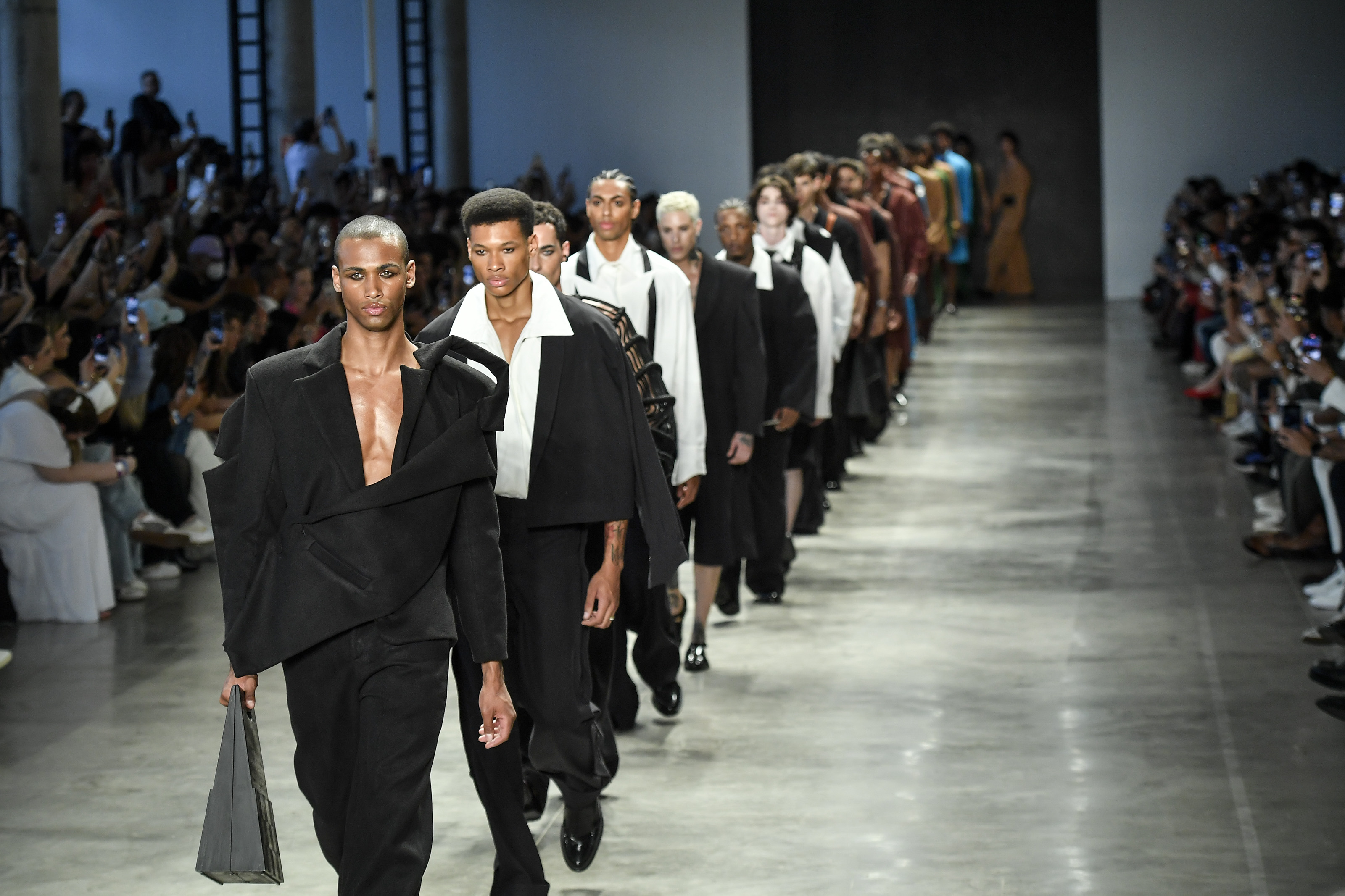 As cores (brancos, cinzas e azuis densos) funcionam como estados de espírito, ora luminosos, ora melancólicos. Há algo de marítimo e de urbano em Fullgás, como se o desfile se passasse entre o mar e o apartamento de Ipanema onde a canção nasceu. Tecidos tecnológicos convivem com bases naturais, refletindo o desejo do designer de unir precisão construtiva e suavidade sensorial. Na passarela, as roupas se movem como versos, fragmentadas, sinuosas, quase musicais. O trabalho de modelagem revela o cuidado artesanal característico de Caetano: pregas estruturadas, cortes enviesados e justaposições que remetem à tensão entre razão e desejo presente na obra de Cicero. O corpo não é apenas suporte, mas superfície poética.